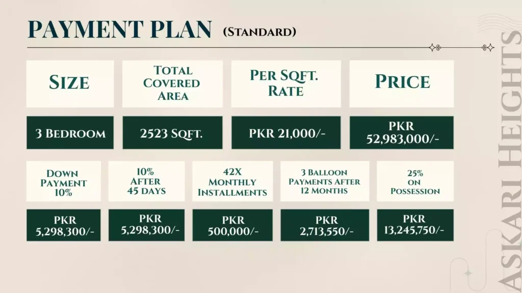 At Askari Heights, we believe that owning your dream apartment shouldn’t be difficult or stressful. That’s why we offer simple, flexible, and affordable payment plans—so you can start living the life you deserve without breaking the bank.
